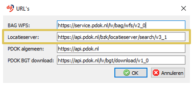 - Plak de nieuwe URL in het veld Locatieserver. Let op, dit is de nieuwe URL: https://api.pdok.nl/bzk/locatieserver/search/v3_1